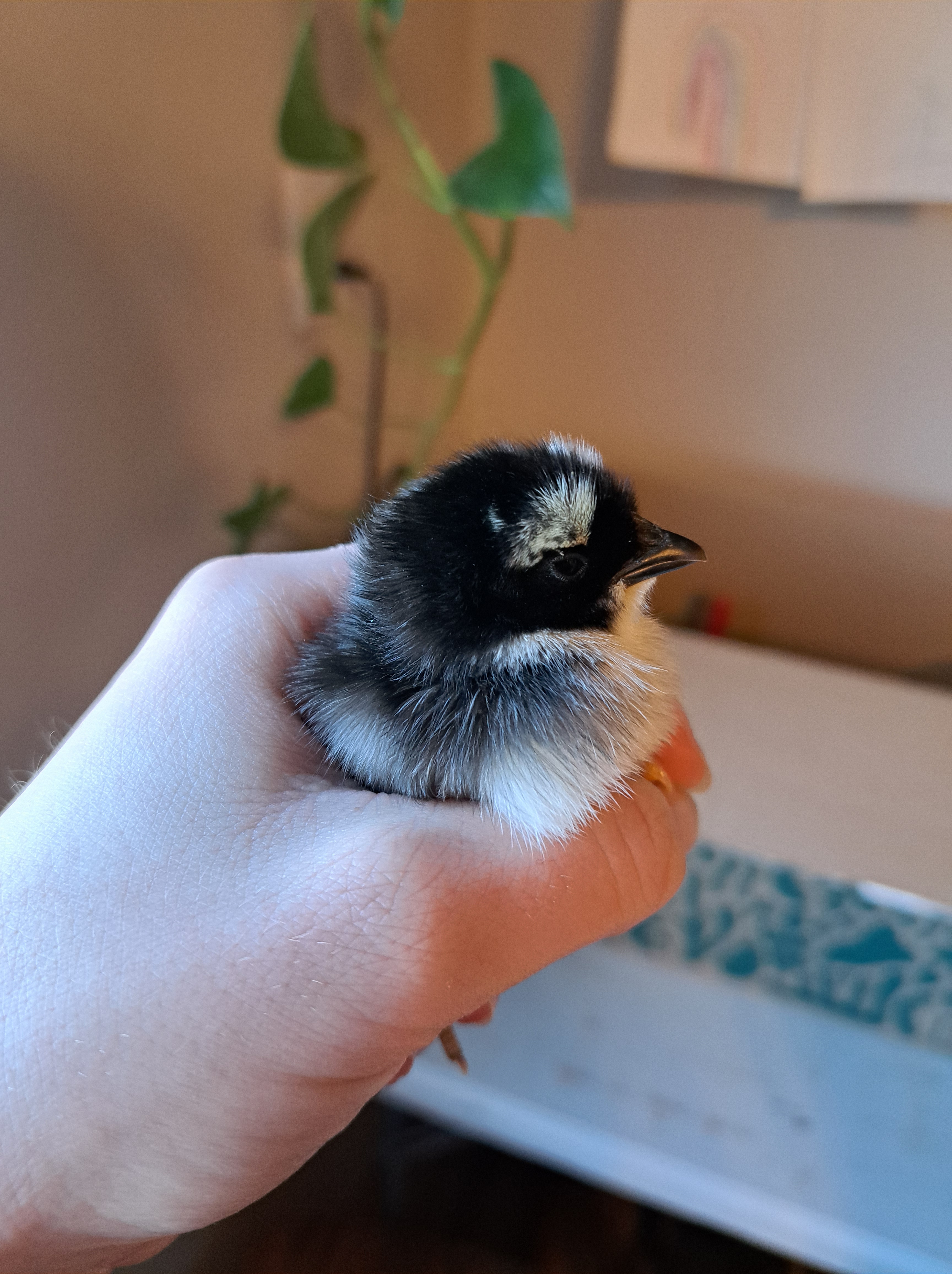 The biggest issue we’ve encountered with our chicks is pasty butt. Chickens have 1 single exit hole: their vent. This is for both laying eggs and waste. Occasionally, chicks’ poo will get clumped up and potentially clog their vent. Check on your chicks daily. If you see it, no need to fret. It’s very easy to clean up! Take your chick to a sink and run lukewarm water – slightly warmer than room temperature. Run their bottom under water and gently help wash away the clumped up poo. Their belly button is below their vent, so if you need to clean up your chick’s bum ensure you are not tugging and picking at everything on their bottom. After their bath, we dry them off and put them under the brooder plate.
