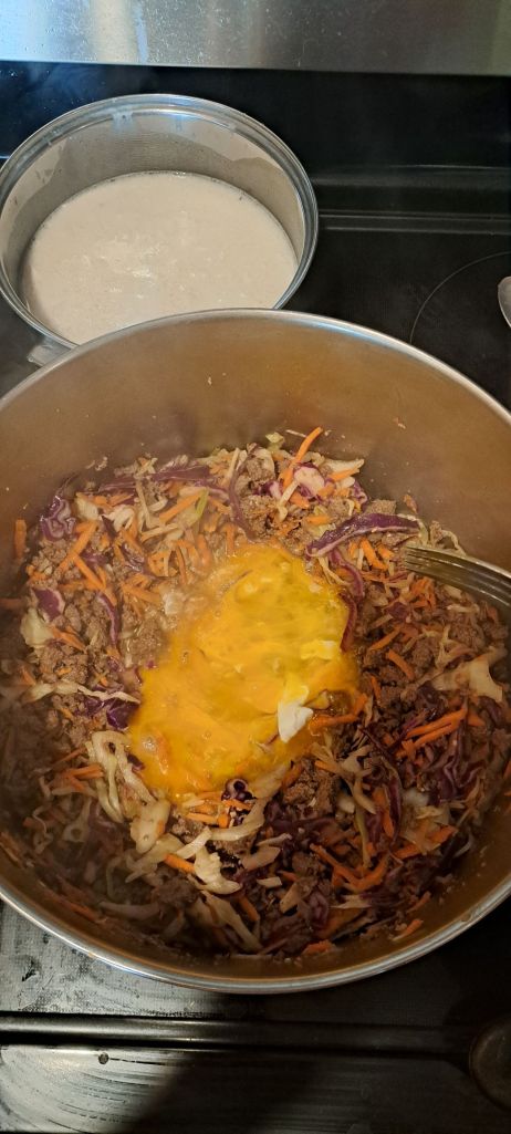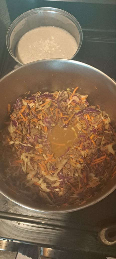 - Once the meat is cooked through, turn heat down to low/med, add the carrots, coleslaw mix, and soy sauce. Cook until the cabbage begins to soften – about 7-10 minutes.